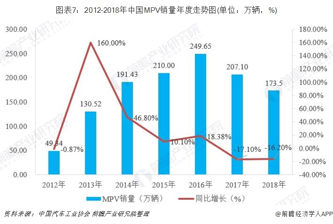 从MPV市场运行情况来看,2012-2016年,我国MPV销量呈现逐年增长趋势,2016年,我国MPV销量达到249.65万辆,同比增长18.38%。随后MPV销量连续下滑,2017年我国MPV销量为207.07万辆,同比下降17.10%,降幅较大。主要原因为多为自主MPV并未进行改款或换代等动作,生命周期老化,产品销售退化; 2018年,我国MPV共计销售173.5万辆,较上期同期下降16.20%,可见销售颓势并未停止。