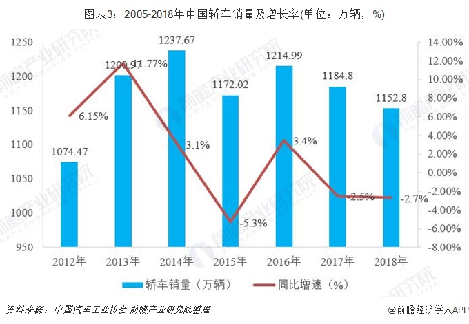 从轿车市场运行情况来看,2012-2014年,我国轿车销量逐年增长,但增速相对有所放缓。2015年,我国轿车销量约为1172万辆,同比下降5.33%;到2016年,我国轿车销量为1215万辆,同比上涨3.4%,随后我国轿车销量持续走低,2018年,中国轿车销量为1152.8万辆,同比下降2.7%。