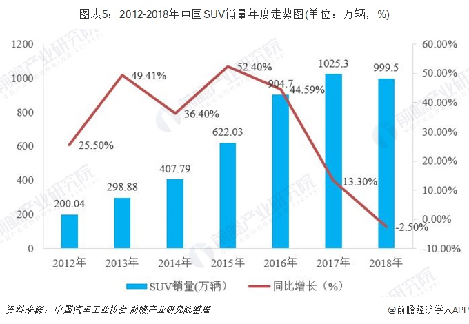从SUV市场运行情况来看,2012年以来SUV市场的发展势头迅猛,2017年SUV市场累计销量实现1025.27万辆,同比增长13.3%,2017年以来,SUV市场发展速度有放缓的趋势, 2018年,中国SUV销量为999.5万辆,较上年同期下降2.5%%。