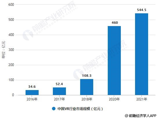 据前瞻产业研究院报告数据显示,我国VR行业从2016年开始发展起来,市场规模迅速增长。2016年,中国VR行业市场规模仅为34.6亿元,至2018年已经突破百亿大关达到108.3亿元。未来五年中,我国VR市场将保持高速增长,年复合增长率将超过80%。预计到达2020年,中国将成为全球数一数二的VR,行业规模将超过450亿元。而这一数据预计到2021年将达到544.5亿元,年复合增长率超过95%。