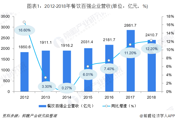 随着餐饮业向产业化规模化发展,餐饮百强企业也不断壮大。根据中国烹饪协会数据,2018年,餐饮百强企业总营业收入2410.7亿元,同比增长12.2%(为当期标的企业营收同比),增速相比上年提升了1个百分点。进入榜单前三甲企业分别为:百胜中国控股有限公司、金拱门有限公司以及海底捞国际控股有限公司。