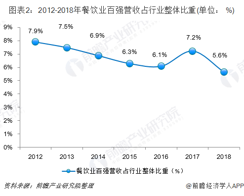 从行业集中度来看,2012-2018年,中国餐饮业行业集中度整体呈下降趋势,2018年,中国餐饮百强企业营收占行业整体营收规模的5.6%,较2017年下降了1.6个百分点。餐饮业行业集中度较低。