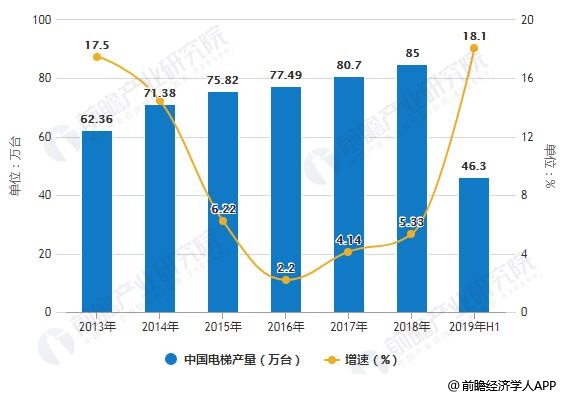 《中国制造2025》的出台为电梯行业的发展提供了政策支持;房地产行业的发展为电梯行业的发展提供了广阔的市场需求;城市化进程的加快促使高层住宅、写字楼、轨道交通、机场、人行天桥等城市建设加快;人们对品质生活的追求也催生了旧楼加装电梯市场,2019年上半年,据国家统计局数据,2019年1-6月全国电梯产量46.3万台,同比增长18.1%,处于高景气区间,因此前瞻产业研究院预测,未来五年国内电梯销售量将迅速增长。