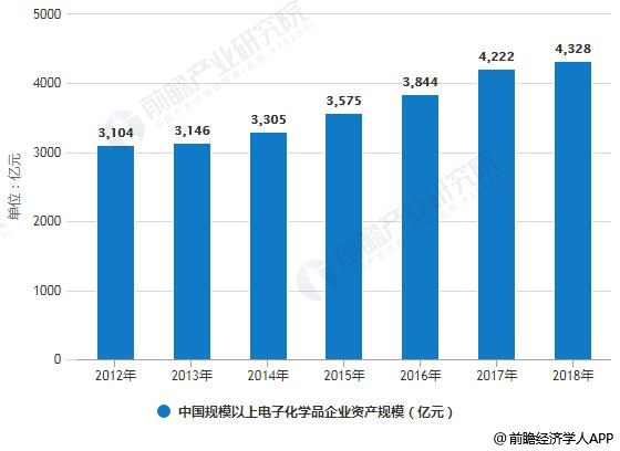 2012-2017年,中国规模以上电子化学品企业资产规模持续增长,2017年企业总资规模为4222亿元,前瞻测算到2018年达到4328亿元。