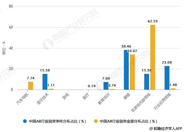 2018年中国AR行业各领域融资事件及金额分布占比统计情况