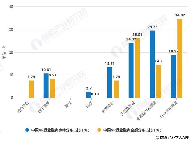 2018年中国VR行业各领域融资事件及金额分布占比统计情况