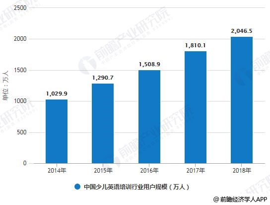 在少儿英语考级受到热烈追捧的趋势下,市场对少儿英语培训自然有着强烈需求。目前,不仅中小学开设了英语课程,许多社会培训机构也将少儿英语培训作为其教学重点。随着英语使用的日趋广泛,家长越来越重视孩子的英语学习。很多儿童被送到各种校外英语培训机构,以此来提高孩子的英语学习兴趣。根据前瞻产业研究院测算,2018年,我国少儿英语培训行业用户规模达到2046.5万人,少儿英语培训市场规模已达百亿元的量级,并且以每年15-30%的速度扩张。2018年,我国少儿英语培训行业总体市场需求规模(包含线上线下)达到344.1亿元,同比增长16.86%。