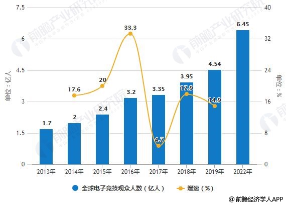 2014-2022年全球电子竞技观众人数统计及增长情况预测
