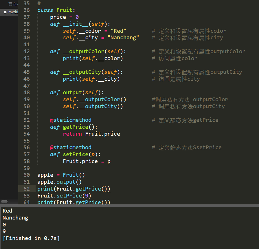 在类中定义的方法大致可以分为3大类:公有方法、私有方法、静态方法。其中,共有方法、私有方法都是属于对象,私有方法的名字以二个下划线__开始的,每个对象都是有自己的公有方法和私有方法,在这二类方法中可以访问属于类和对象的成员;公有方法通过对象名直接调用,私有方法是不能通过对象名直接调用,只能在属于对象的方法通过self调用或在外部通过python支持的特殊方法调用。如果通过类名来调用属于对象的公用方法,需要显示为该方法的self参数传递一个对象名,用来明确指定访问哪个对象的数据成员,静态方法可以通过类名和对象名调用,但不能直接访问属于对象的成员,只能访问属于类的成员