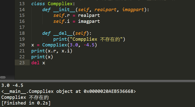 【在删除x对象变量之前,x是存在的,在内存职工的标识0x0000020AEB536668,执行del x语句之后,x对象变量就不存在了,系统就会自动调用析构函数,所以出现Comppliex 不存在了】