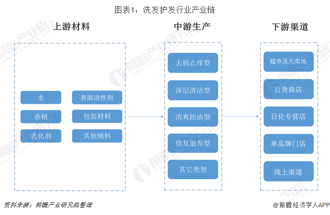 洗发护发行业的上游行业主要为原料及包装材料制造行业。其中原料包括、香精、乳化剂、表面活性剂剂等;包装材料主要包括包装纸、塑料包装、软包装膜袋和玻璃包装等。目前市面上的洗发用品主要分有去屑止痒型洗发水、深层清洁型、清爽控油型、修复滋养型以及混合型等等。