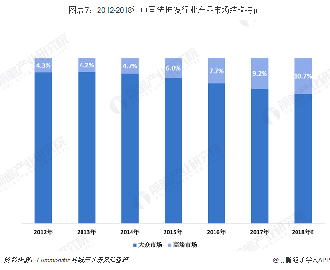 高端洗护市场成为当前竞争新趋势,外资巨头宝洁、联合利华纷纷推出“无硅油”中高端洗护套装,国内一些高端洗护品牌也陆续面世,加上早已经在高端洗护领域深耕多年的品牌资生堂、汉高,和阿道夫等,一时间高端洗护市场品牌扎堆,争相分食高端洗护的红利。根据Euromonitor公布的数据,2012-2017年中国洗护发高端产品的市场占比呈递增趋势。2017年中国洗护发产品高端市场占比为9.2%,大众市场占比为90.8%。预计2018年,高端市场的份额会进一步提高,达到10.7%左右。