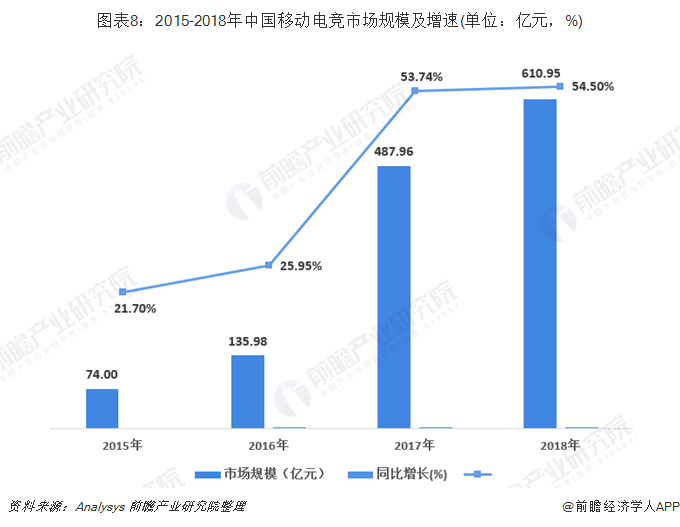 2015-2016年,PC电竞占据整个电竞行业的主导地位,随着互联网的发展和用户上网习惯的改变,移动电竞开始崛起,《王者荣耀》《全民枪战》等移动网游开始风靡,移动电竞的市场份额也开始超过PC电竞。2018年,移动电竞的市场份额达到54.5%,PC电竞的市场份额为45.5%;移动电竞的市场规模超过600亿元,同比增长54.50%,为近年来最快增速。从目前的市场来看,移动电竞的市场份额占比将会进一步增加。