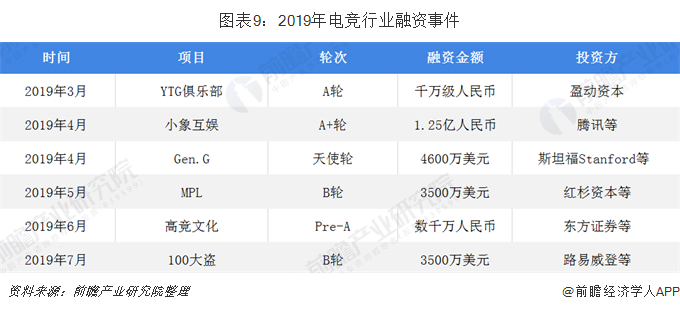 在经济下行的环境下,许多公司融资变得困难,但电竞行业融资依然非常活跃。2019年3月,王者荣耀俱乐部YTG宣布获得千万级人民币的A轮融资,投资方为盈动资本。2019年6月,电子竞技赛事运营商高竞文化完成Pre-A轮数千万元人民币融资,由东方证券旗下公司领投。