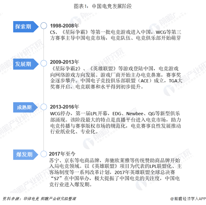 1998年,CS、《星际争霸》等电竞游戏进入中国,中国电竞产业开始萌芽。经过多年的发展,电竞产业在中国已经逐步走向成熟产业。