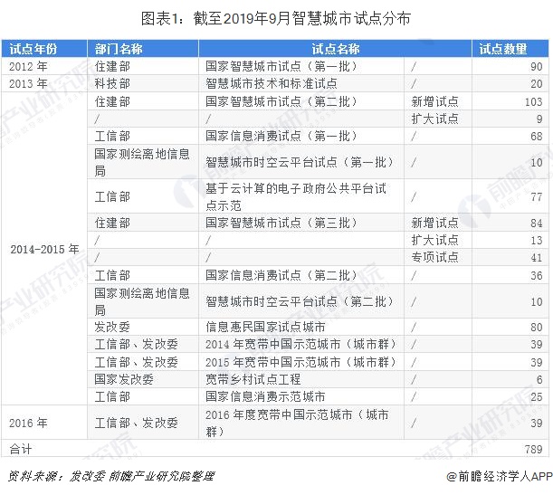 从国家开始推进智慧城市建设以来,住建部发布三批智慧城市试点名单确定290个试点城镇。而如果计算科技部、工信部、国家测绘地理信息局、发改委所确定的智慧城市相关试点数量,截至2019年9月我国智慧城市试点数量已经超过700个(其中部分城市有重叠)。