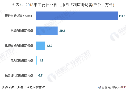 自助服务终端在主要领域已经有了很典型的应用案例,如银行业的ATM(自助存取款机)、电力行业的APM(自助缴费机)、轨道交通行业的AFC(自动售检票系统)等,而在我国,银行业自助服务终端应用数量最多,占据了自助服务终端的绝大部分市场份额。