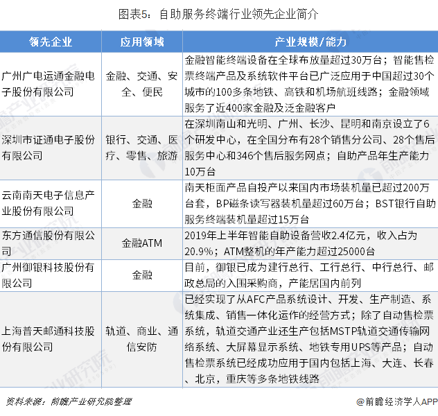 目前,国内自助服务终端的领先企业主要包括广电运通、南天信息、御银股份等。