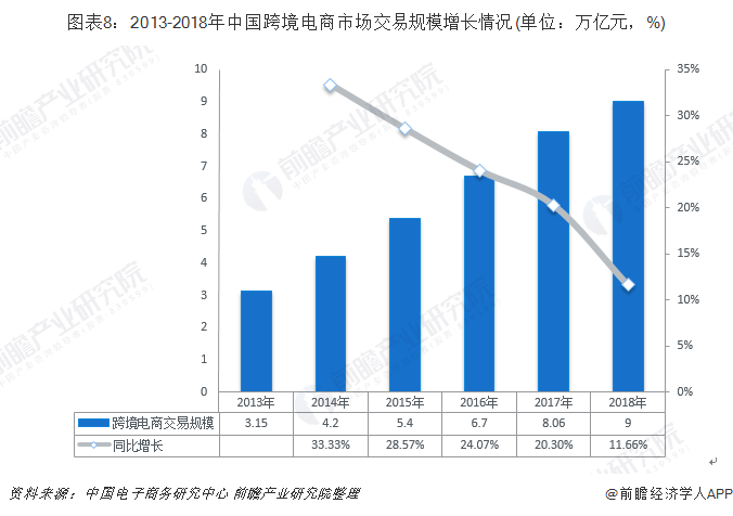 根据中国电子商务研究中心发布统计数据,2013-2018年我国跨境电商市场交易规模保持高速增长趋势。2018年我国跨境电商依然保持持续增长,交易规模达到9万亿元,得益于一系列制度支持和改革创新以及互联网基础设施的完善和全球性物流网络的构建交易规模的日益扩大。总的来说,跨境电商正成长为推动中国外贸增长的新动能。