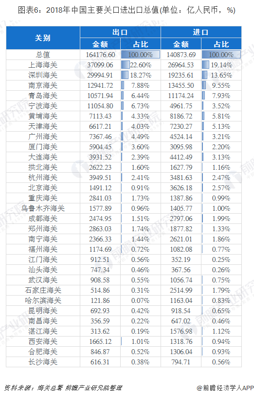 2018年,在我国的主要关口中,以上海海关的进出口值为最高,其中,出口值为37099.06亿人民币,占比为22.60%,进口值为26964.53亿人民币,占比为19.14%;其次为深圳海关,其中,出口值为29994.91亿人民币,占比为18.27%,进口值为19235.61亿人民币,占比为13.65%;位列第三的是南京海关,其中,出口值为12941.72亿人民币,占比为7.88%,进口值为13455.50亿人民币,占比为9.55%。