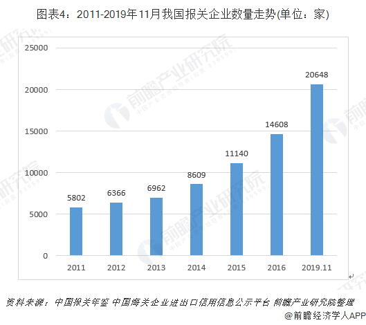 根据中国海关企业进出口信用信息公示平台统计,截至2019年11月,目前海关报关企业名录共有20648家。从趋势上看,这种增长的态势还将继续,未来市场空间较大。