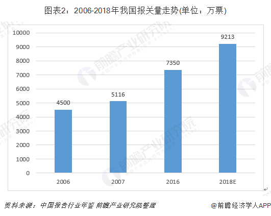 我国报关行业起步于上世纪80年代,经历了初创期、发展期和成熟期3个发展阶段。进出口贸易的迅猛增长同时也促进了我国报关业的发展。根据中国报关行业年鉴,2000年我国报关量尚不足2000万票,而2016年已达到7350万票。前瞻根据我国进出口总额走势测算,2018年,我国报关量达到9213万票。按照每票报关价格为0.19万计算,2018年,我国报关行业市场规模达到1751亿元左右。