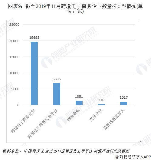 根据中国海关企业进出口信用信息公示平台统计,截至2019年11月,我国共有23265家跨境电子商务企业,涉及跨境电子商务企业、跨境电子商务交易平台、物流企业、支付企业、监管场所运营人5种类型。