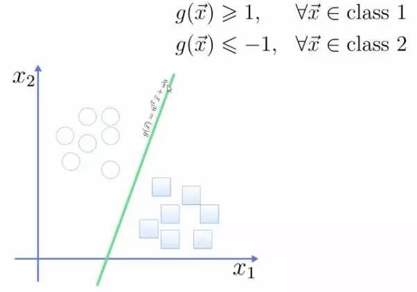将这个超平面表示成一个线性方程,在线上方的一类,都大于等于1,另一类小于等于-1: