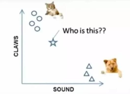 例子:要区分“猫”和“狗”,通过“claws”和“sound”两个feature来判断的话,圆形和三角形是已知分类的了,那么这个“star”代表的是哪一类呢?