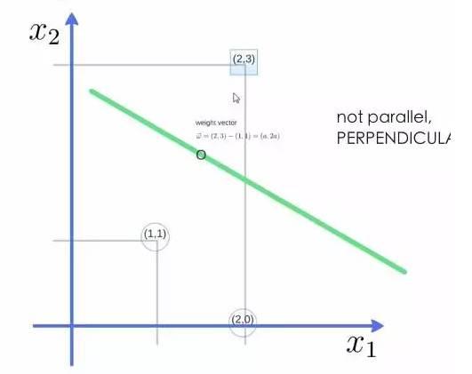 举个例子,三个点,找到最优的超平面,定义了 weight vector=(2,3)-(1,1):