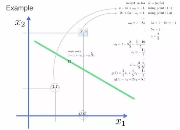 得到weight vector为(a,2a),将两个点代入方程,代入(2,3)另其值=1,代入(1,1)另其值=-1,求解出 a 和 截矩 w0 的值,进而得到超平面的表达式。