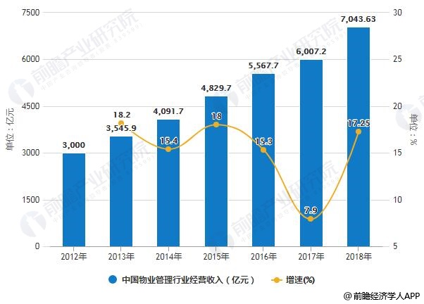 2012-2018年中国物业管理行业经营收入统计及增长情况