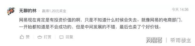 但有人也有不同的观点,球友@无聊的林说:网易现在肯定是有投资价值的啊,只是不知道什么时候会失去。就像网易的电商部门,一开始都知道是不会成功的,但是中间发展的不错,最后也卖了个好价钱。