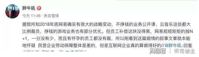 还有人对本次“裁员事件”持怀疑态度,比如雪球用户@胖牛吼:据我所知2018年底网易确实有很大的战略变动,不挣钱的业务公开课、云音乐这些都大比例裁员,挣钱的游戏业务也有部分优化。