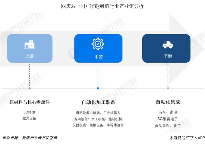 我国智能制造产业链的上游为原料和核心零部件供应商,中游为自动化加工装备供应商,主要包括通用设备、专用设备、仪器仪表等,产业链的下游主要为自动化集成,应用领域包括汽车、家电、3C消费电子等。