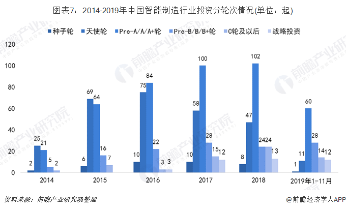 分轮次来看,近年来,我国行业投资主要集中在前期。2018年,我国智能制造行业Pre-A/A/A+轮共发生102起投资事件,天使轮共发生47起。