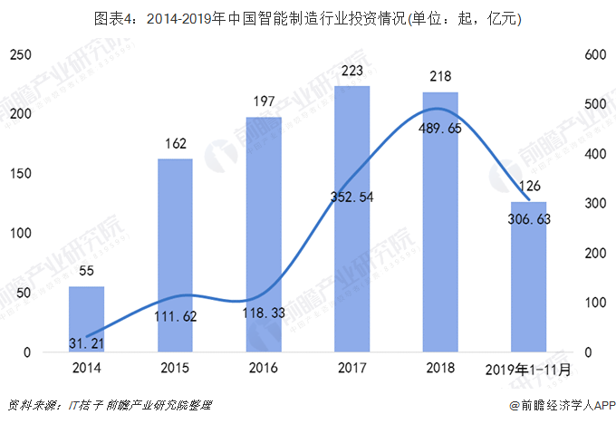 从我国智能制造行业的投资情况来看,2018年,我国智能制造行业共发生218起投资事件,投资额达489.65亿元。2019年1-11月,我国智能制造行业共发生126起,行业投资火热。