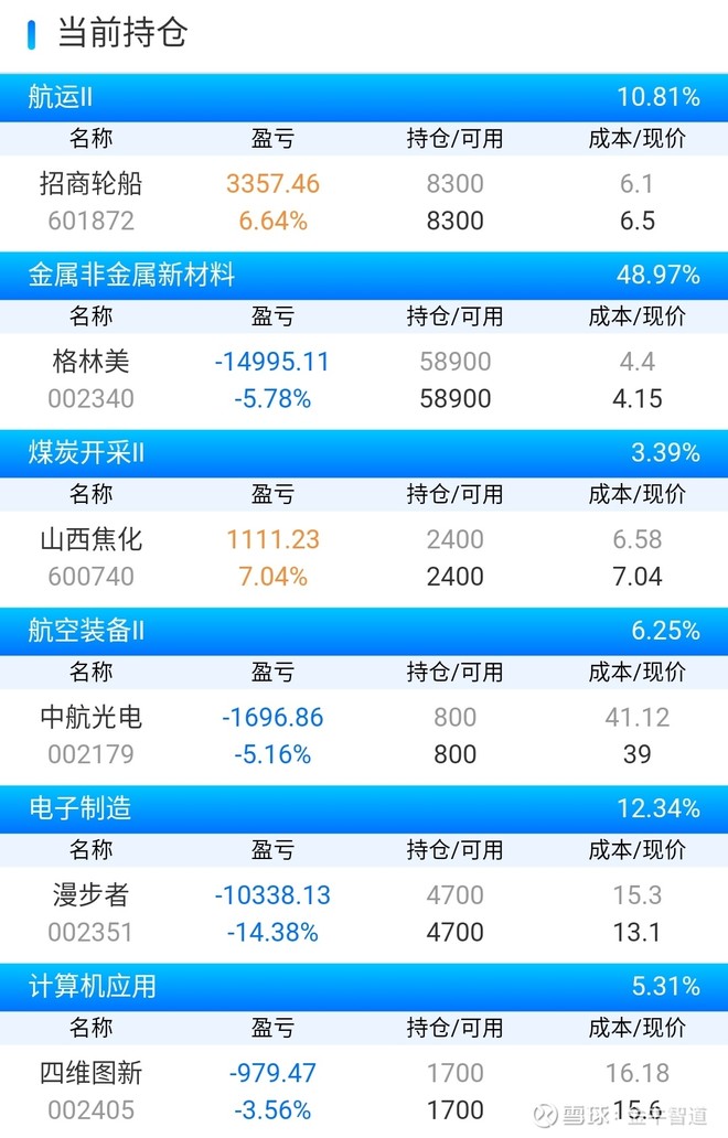 我今天的持仓有招商轮船,山西焦化,格林美,中航光电,漫步者,四维图新。