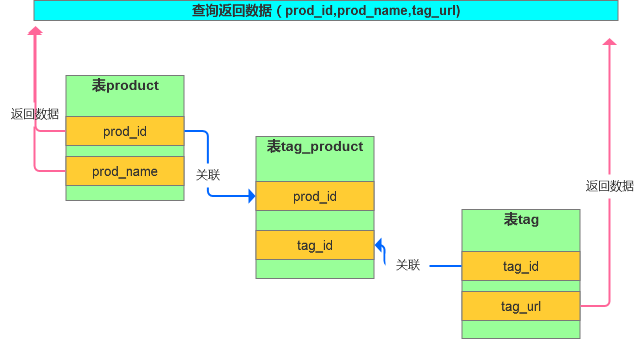 整个SQL的逻辑是输出其中product表的数据(字段prod_id,prod_name)和tag表的数据(tag_url),其中表tag和表tag_product)他们通过字段(tag_id)进行关联,然后和外部的表使用prod_id进行关联,为了体现出是left join(左连接),我把表product的位置及往上放了放。