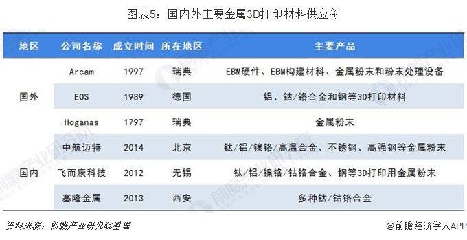 近年来,随着3D打印商业化应用持续推广,打印材料的重要性愈发凸显。目前国内的基础3D打印材料已基本满足国产设备的增材制造需要,但高性能金属粉末耗材依然依赖进口,国产材料在纯净度、颗粒度、均匀度、球化度、含氧量等对打印成品性能影响较大的原料指标方面相比国外仍存在较大的差距。德国的EOS、TLS,瑞典的Arcam、Hoganas、Sandvik,比利时的Solvay等具备较强实力的金属3D打印耗材供应商多数成立于2000年以前,在粉末冶金或金属打印设备领域有较强的技术积淀。国内目前能提供高质量金属粉末的公司包括中航迈特、飞而康、塞隆金属、西安欧中、铂力特以及新进入的钢研高纳、顶立科技等,这些公司或相关业务多数成立于2010年以后,近年来发展较快。