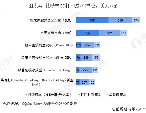原材料是金属3D打印的制造成本中占比最大的一部分。DigitalAlloys以钛粉末(6Al-4V)为例,对于SLM、EBM、DED、Binder Jetting、Digital Alloys等主流的金属3D打印工艺的制备成本进行统计,发现每千克产品的打印成本中原材料成本是占比最高的(除SLM工艺外),同时随着成型精度、成型质量、打印时间的增长,设备、维护和人工的占比逐步提升,在打印质量最好的SLM工艺中,设备、维护和人工成本是占比最高的,其中也有专利保护因素,但是在打印效率越来越高、规模效应越来越明显的趋势下,材料成本占比将进一步提升。