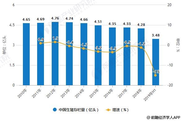 生猪存栏量方面,2010-2018年,我国生猪存栏量维持在4.2亿头以上。2018年,全国生猪存栏量达4.28亿头,同比下滑1.2%;2019年上半年,生猪存栏量3.48亿头,同比下降15%,下半年受猪瘟疫情影响,全年生猪存栏量可能继续下滑。