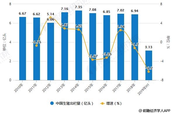 2010-2019年H1中国生猪出栏量、存栏量统计及增长情况