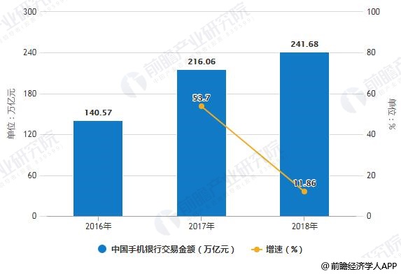 中国手机银行交易金额逐渐上升,2018年已达241.68万