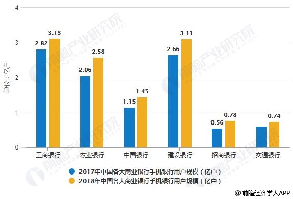 2017-2018年中国各大商业银行手机银行用户规模统计情况