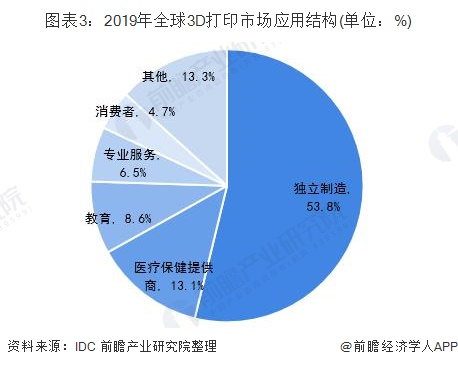 3D打印产业的蓬勃发展,主要源于产业的定制化能力高,可应用的场景相当多样,目前在各产业与场景的深度融合状况也都较为乐观。从应用领域来看,3D打印的最大市场将是独立制造,占比达到53.8%;其次是医疗保健,占比约为13.1%;教育领域、专业服务领域以及消费者服务领域占比分别为8.6%、6.5%和4.7%。