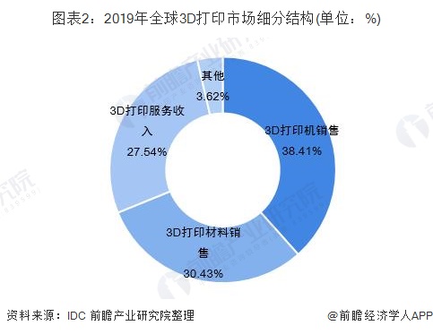 从细分领域来看,3D打印机和3D打印材料的销售成为最大的收入来源。在2019年全球138亿美元的3D打印市场规模中,将有53亿美元来自打印机销售,42亿美元来自打印材料销售,38亿美元来自打印服务,占比分别为38.13%、30.22%和27.34%。