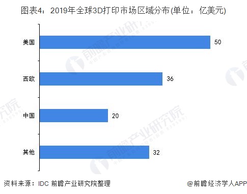 以地域计,美国仍是全球最大市场,2019年的市场规模预计为50亿美元。美国是3D打印产业的起源地,在全球3D打印市场中持续领先。同时,美国的研发脚步从未停止,2019年11月中旬,美国社区和经济发展部向匹兹堡大学和卡宾德综合公司拨款57000美元,以研究使用碳化钨粉末进行3D打印的有效方法。此外,西欧和中国紧随其后,2019年3D打印市场规模预计分别为36亿美元和20亿美元。