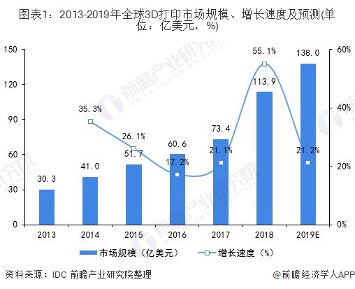 3D打印作为第四次工业革命的代表技术之一,对各产业产生了许多价值,越来越受到工业界和投资界的重视。目前投资于3D打印技术研发的企业包含了空中巴士、阿迪达斯、福特、丰田等知名企业。2018年全球有能力自主“研发与生产”3D打印机的企业有177家,产业内的系统性玩家开始增加,意味着打印机的相关研发、制造技术趋于成熟。根据市场研究机构IDC预计,2019年全球3D打印的市场规模将达到138亿美元,比2018年扩大21.2%。