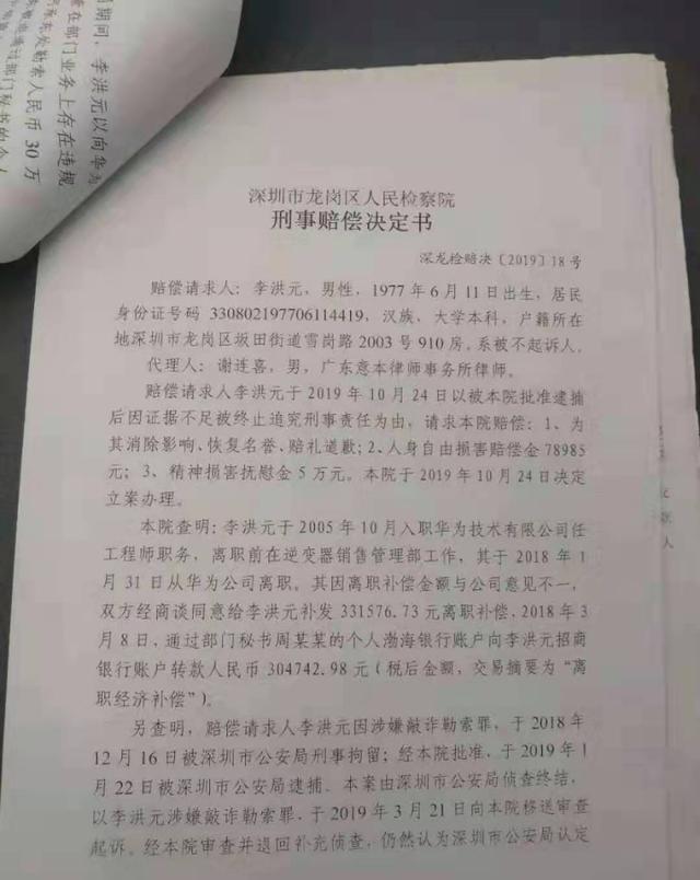 李洪元发给记者的深圳市龙岗区人民检察院刑事赔偿决定书中显示,他在2005年进入华为,在华为任职13年。据记者了解,李洪元的第一份合同签到了2006年9月30日。随后又续签了5次合同,每次续签的时间从一年到两年一个月不等,第六次合同到期的时间是2013年12月31日。